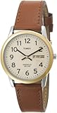 I like this watch- it's inexpensive, keeps time, and has indiglo- the day and date is displayed where the number 3 would be and is very easy to read. The band fits well and is comfortable. The brass/gold face and brown band accent most apparel well.