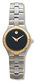 I got this watch for our 20th Wedding Anniversary. I looked at a lot of models and finally decided on this one. After looking at bangle-type watches like the Bela model, I decided that those scratched too easily. Diamond accents end up costing a lot more than the actual value of the diamonds. Gold-plating will eventually wear off, so that's why I chose a watch with just an accent of gold, and which won't be too noticeable if it does wear. For those of us smaller women, this watch is very good if you have a thin wrist because it can be easily sized. Plus the watch doesn't look too large on my wrist and it is very readable. The only negative is that you must keep the crystal clean because it will show grease against the black background. After much back-and-forth, I ended up buying from a Movado dealer during a sale. Because Amazon isn't an authorized dealer, you don't get the Movado warranty. I have confidence in Amazon, however. I asked the Movado dealer about warranties and he said that most people don't have problems with battery-operated watches, so the warranty isn't as important with this type of watch. So far I'm very happy with the watch, and I don't anticipate any problems with it.